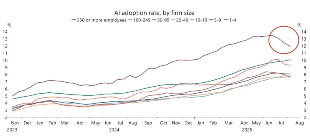 A recent US Census Bureau survey of 1.2 million firms asked businesses whether they had used AI tools in the previous two weeks. The data suggests AI adoption has been declining among companies with more than 250 employees.