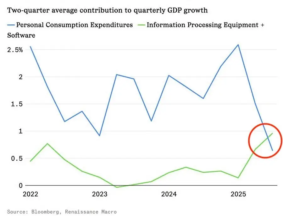 The enormity of the AI buildout is such that, in the US, spending on the AI buildout is now adding more to GDP growth than consumer spending.