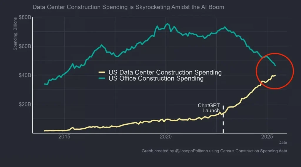 The value of data centers under construction is set to surpass office buildings. (Source: @JosephPolitano)
