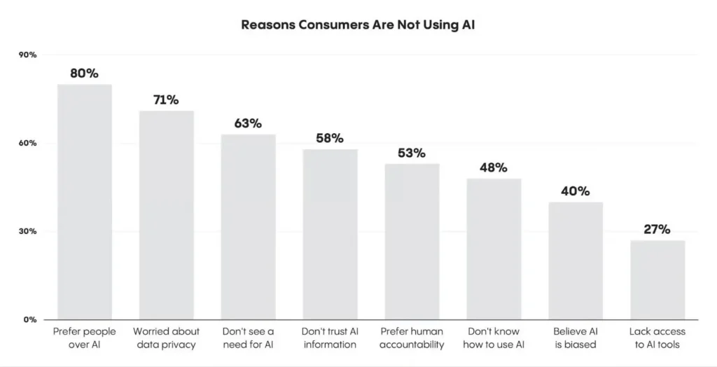 In the meanwhile, a survey of 5,031 representative U.S. adults revealed one barrier to AI adoption over all else: 80% say they prefer interacting with people over AI.